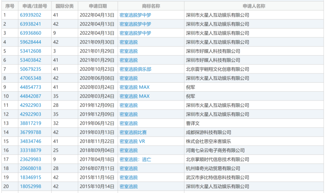 圖6:“密室逃脫”商標注冊公示信息,查詢時間:2022年5月,來源:國家知識產權局