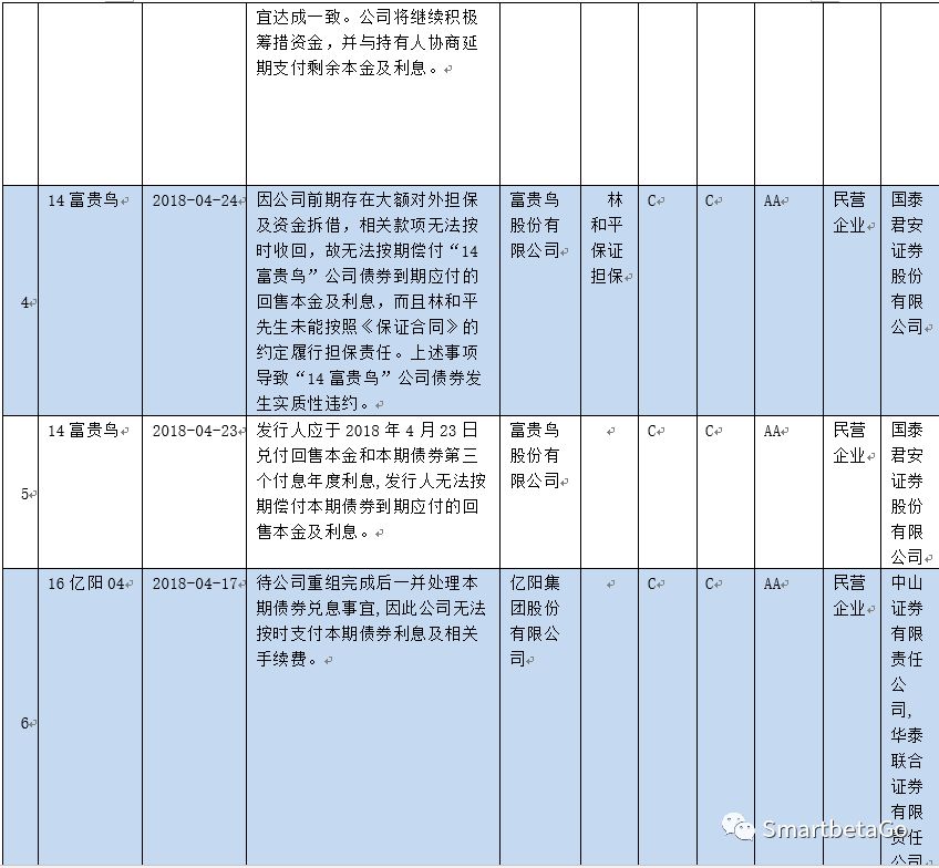 2018年以來新增違約債券21只,其中6家公司為新增違約主體,分別為:富貴鳥股份股份有限公司、凱迪生態(tài)環(huán)境科技股份有限公司、神霧環(huán)保技術(shù)股份有限公司、億陽集團(tuán)股份有限公司、中安消股份有限公司、上海華信國際集團(tuán)有限公司,其中上海華信國際集團(tuán)有限公司是首個違約的AAA級發(fā)債主體。