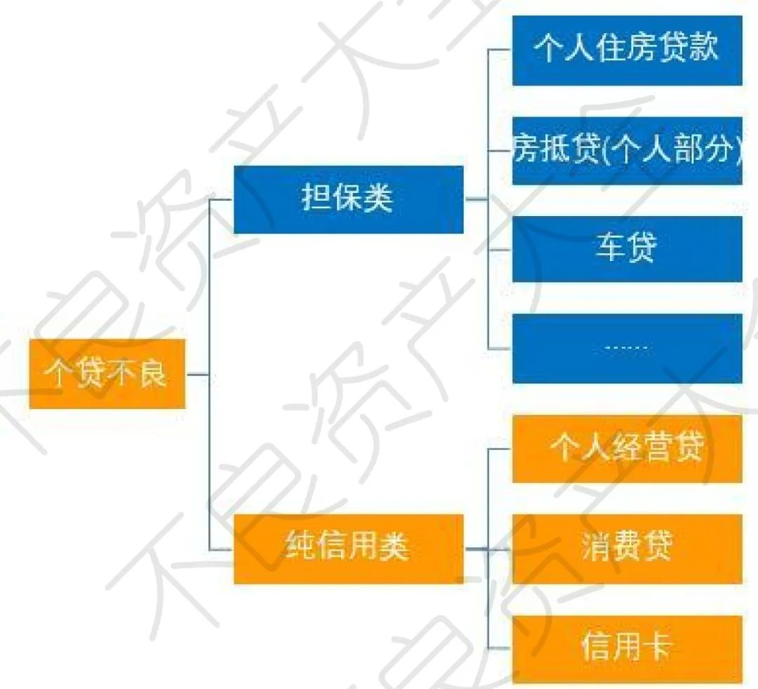 銀保監(jiān)會(huì)于2021年1月7日發(fā)布的《關(guān)于開展不良貸款轉(zhuǎn)讓試點(diǎn)工作的通知》(以下簡(jiǎn)稱《通知》)實(shí)際上開放的是銀行業(yè)純信用類個(gè)貸不良,即上圖中黃色部分。當(dāng)然,對(duì)于非銀債權(quán)人則不受《通知》限制,總體上除了個(gè)人住房貸款以外都可以參與。