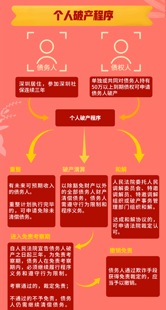 值得強(qiáng)調(diào)的是,在深圳居住且連續(xù)參加深圳社保滿三年的債務(wù)人本人,單獨(dú)或者共同對(duì)上述債務(wù)人持有五十萬(wàn)元以上到期債權(quán)的債權(quán)人,或上述債務(wù)人的配偶(在債務(wù)人/債權(quán)人申請(qǐng)債務(wù)人破產(chǎn)時(shí)同時(shí)為自己申請(qǐng))有資格申請(qǐng)破產(chǎn)。