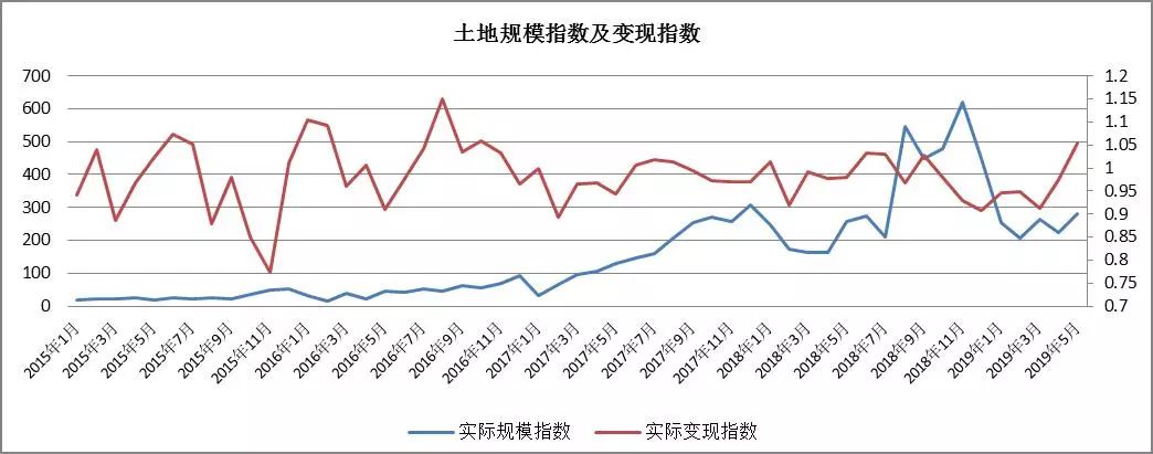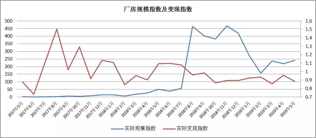 • 趨勢分析:工業用房成交量在 2018年8月與11月規模激增,之后開始下降,至2019年3月有所增加,4月、5月總體平穩;工業類房產的變現指數自2018年5月以來顯著持續下滑,仍有下滑趨勢。