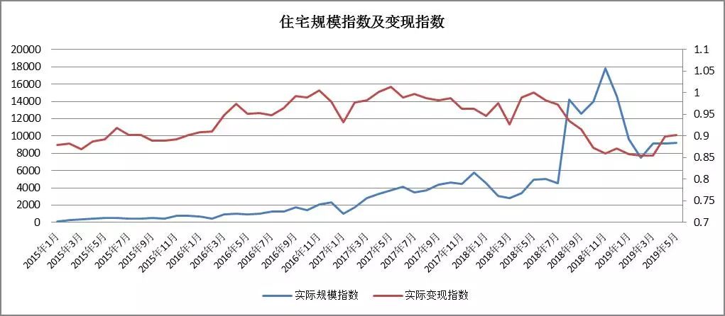 • 趨勢分析:住宅類房產的成交量自2015年1月以來至2018年8月呈指數型增長,此后成交量在高位震蕩了4個月后開始逐漸下滑;2015年1月至今,住宅類房產的變現能力呈現出先增后降的趨勢,2018年5月以后開始逐漸下滑,2019年5月的月度平均變現折扣率僅為90.19%。