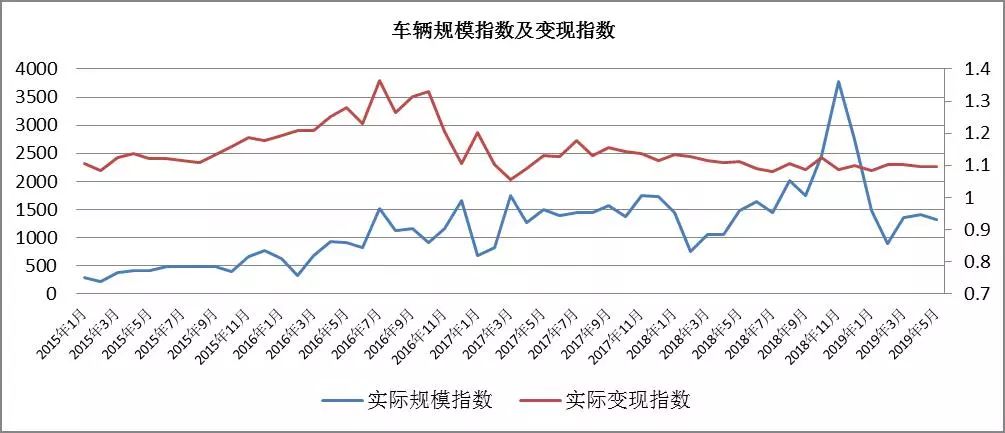 • 趨勢分析:車輛成交規模在2019年1月達到交易高峰,之后大幅下滑。機動車類資產變現能力非常強,絕大多數月份的平均變現折扣率都在110%以上,目前變現指數趨于穩定,存在溢價空間,在105%上下。