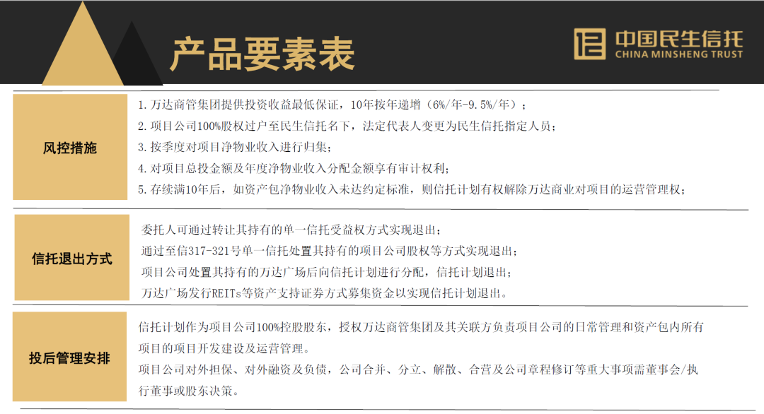 在產品推介要素表當中,強調了該信托計劃的資金用于設立單一信托,收購北海、撫州、九江、雅安和遼陽五家萬達廣場項目公司100%的股權,同時向項目公司發放股東借款。