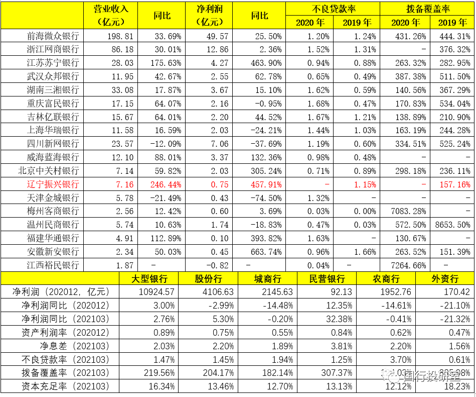 這里主要結合各民營銀行最新財報(除無錫錫商銀行還未公布、遼寧振興銀行最新數據僅為2019年外,其余17家民營銀行均為2020年數據)公布的信息。