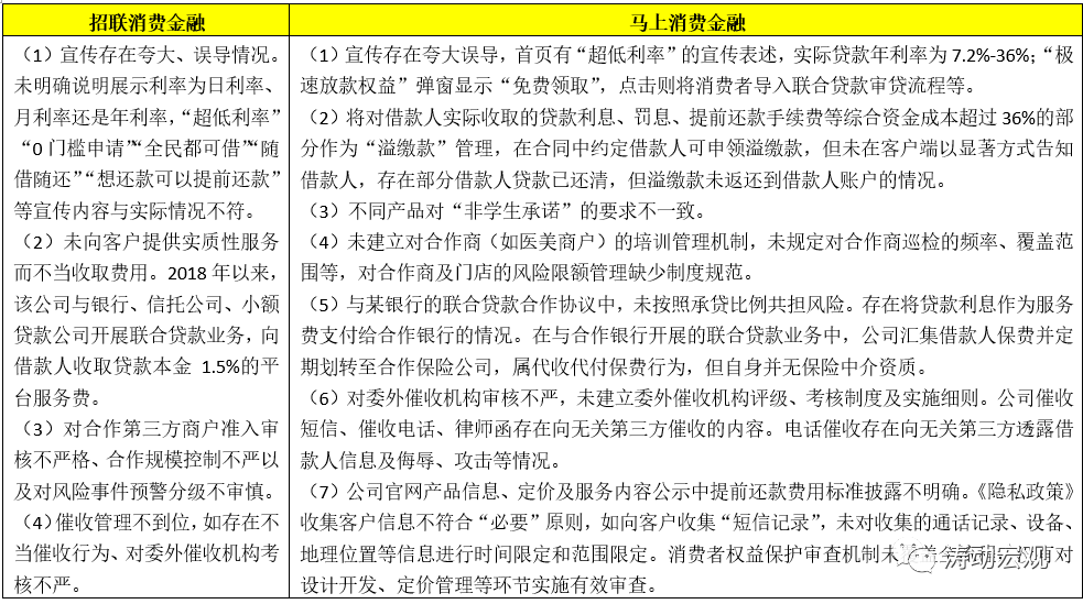 (2)馬上消費金融存在營銷宣傳夸大誤導、產品定價管理不規范、學生貸款管理不規范、合作商管控不嚴、聯合貸款管理不到位、不合規催收、消費者權益保護體制機制不完善等問題。