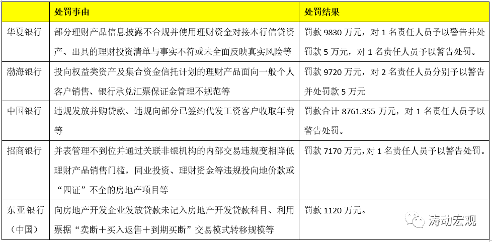 2021年5月,銀保監會查處華夏銀行、渤海銀行、中行、招商銀行、東亞銀行(中國)等5家機構違法違規行為,處罰金額合計約3.66億元,處罰事由包括理財資金對接本行信貸資產、理財產品發售不合規、違規發放并購貸款、違規向房地產項目融資等。
