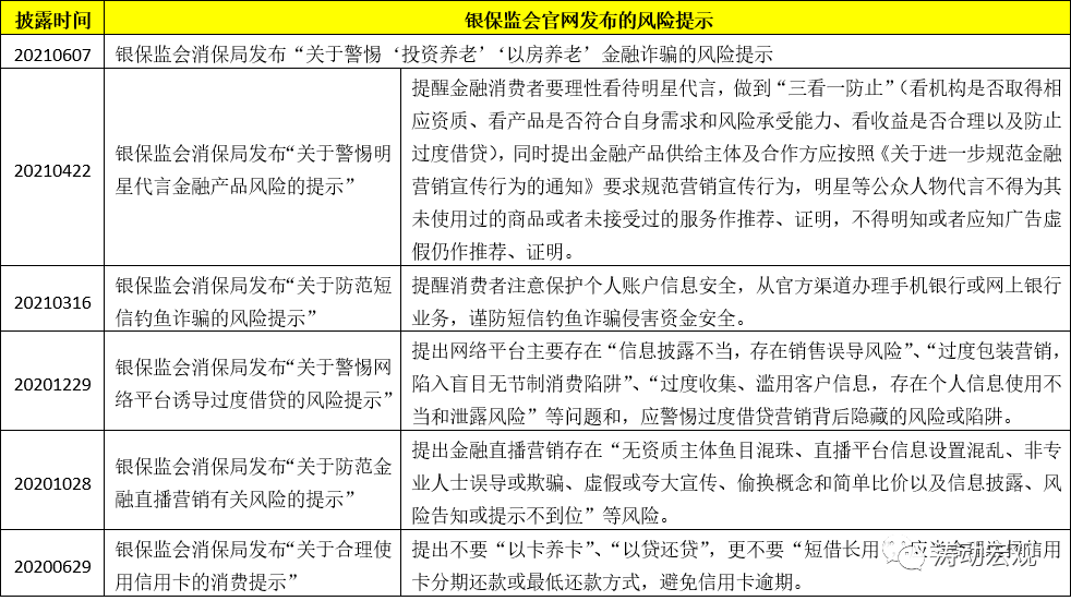 2020年6月以來,銀保監會消費者權益保護局通過官網發布了一系列風險提示,來加強金融消費者權益保護。具體看,