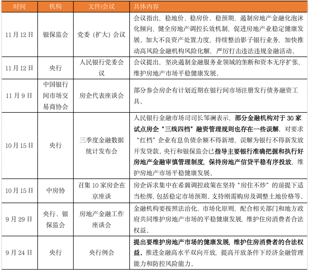 10月15日,中房協在京召開房企座談會,住建部相關人員參與,此時,房企的訴求主要集中在堅持“房住不炒”前提下適當松綁,包括穩定市場預期、支持剛需購房及調整土地價格等,可見房企經營壓力。
