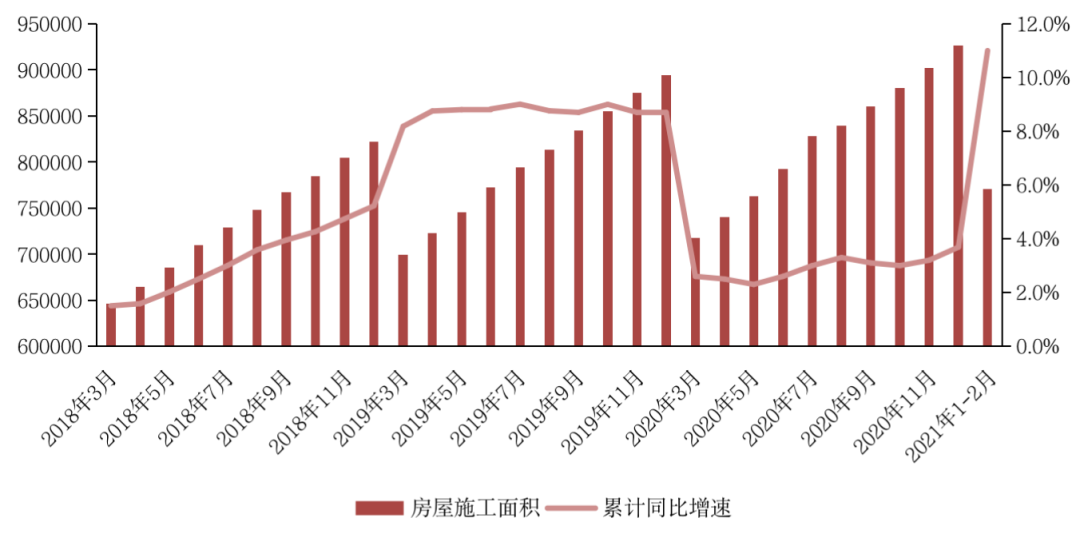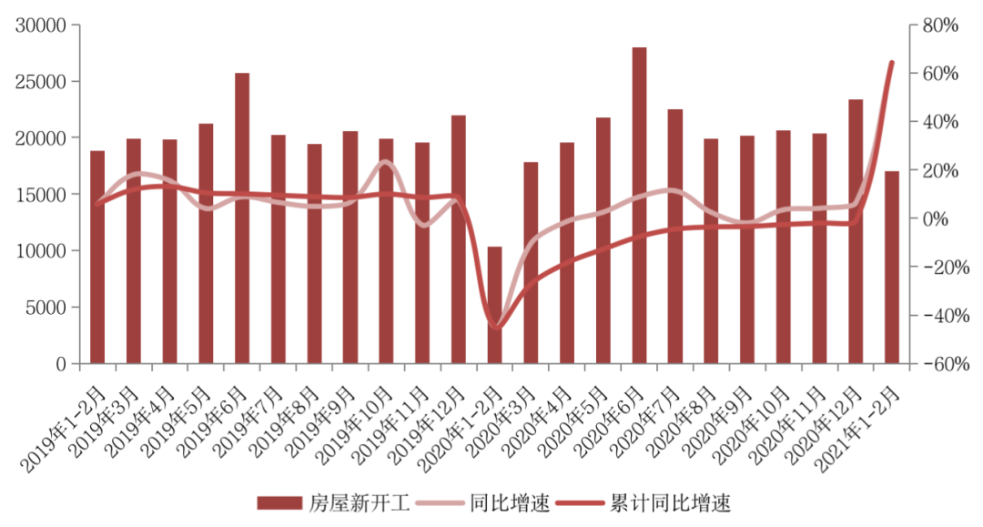 國家統計局數據顯示,2021年1-2月房屋新開工面積17037萬平方米,同比增長64.3%,相較2019年同期下降9.4%。融資三道紅線約束下,房企融資依然承壓,多以搶施工、促回款為第一要務,相較而言,新開工意愿不足。