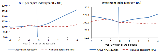 分析顯示,減少不良貸款率的國家比那些讓不良貸款率停滯不前的國家經(jīng)歷了更快的GDP增長和更多的投資。我們發(fā)現(xiàn)被動組的這種效應(yīng)更強,但沒有統(tǒng)計學(xué)意義。在積極行動的情況下,其結(jié)果明顯好于拖延癥群體——每年,不良貸款問題沒有得到解決,就人均GDP增長而言,經(jīng)濟損失超過兩個百分點(圖3)。