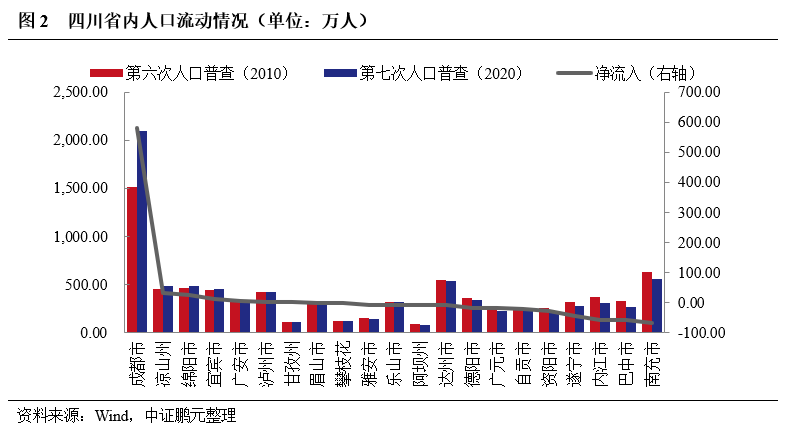 省會成都市對省內人口“虹吸”效應強。成都市作為全省的經濟、金融中心和交通通信樞紐,近十年持續聚集全省人口。2020年末成都市常住人口突破2,000萬,占全省人口的比例約1/4,較第六次全國人口普查增長581.89萬人;全省13個地市(州)出現人口凈流出。分五大經濟區[2]看,成都平原經濟區常住人口為4,193.5萬人,占50.12%;川南經濟區常住人口為1,447.3萬人,占17.3%;川東北經濟區常住人口為1,926.6萬人,占23.02%;攀西經濟區常住人口為607.1萬人,占7.25%;川西北生態示范區常住人口為193萬人,占2.31%。