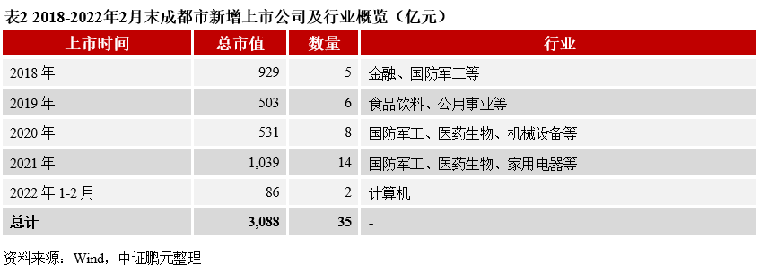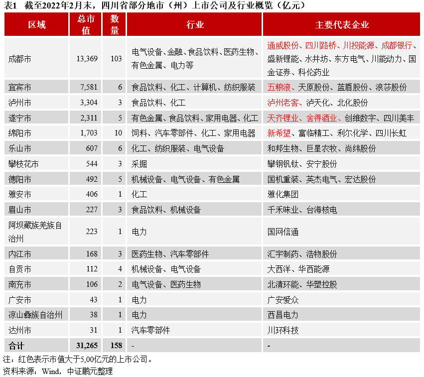 成都為全省上市公司聚集地,產業較為發達;宜賓、瀘州以白酒為代表性產業,大部分地市(州)產業基礎較為薄弱。四川省上市公司主要集中在成都市,成都上市公司數量為103家,總市值1.34萬億元;宜賓和瀘州上市公司總市值分別為7,581億元和3,304億元,其余地市(州)上市公司總市值均不足3,000億元;巴中市、資陽市、廣元市和甘孜藏族自治州無上市公司。具體來看,成都市上市公司行業分布較廣,大型上市公司(市值超過500億)包括通威股份、四川路橋、川投能源、成都銀行,近年新增上市公司以國防軍工、醫藥生物和計算機等行業為主;宜賓、瀘州和綿陽的大型上市公司各有1家,分別為五糧液、瀘州老窖和新希望;遂寧有2家大型上市公司,為天齊鋰業、舍得酒業;其余地市(州)無大型上市公司,產業基礎相對薄弱。