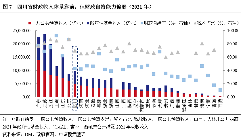 四川省財政收入體量靠前,但財政自給能力偏弱。2021年,四川省實現一般公共預算收入4,773.30億元,居全國第七位,同比增長12%;其中稅收收入3,334.8億元,占一般公共預算收入的比例為69.86%;政府性基金收入4,950.50億元,其中國有土地使用權出讓收入為4,441.3億元,同比增長3.5%。同期一般公共預算支出11,215.6億元,財政自給率為42.56%,財政自給水平偏弱,對上級政府補助及轉移支付依賴程度較大。