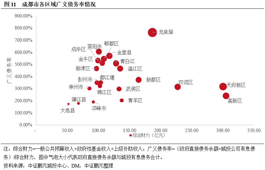成都市內龍泉驛、簡陽市、金堂縣廣義債務率較高,債務負擔較重。從成都市內各區域債務分布來看,廣義債務規模前四大區域為龍泉驛、天府新區、高新區和雙流區,規模分別為1,423.95億元、948.51億元、731.22億元和714.69億元;其次是金堂縣、青白江區、溫江區、新都區和簡陽市,廣義債務規模在600-700億元之間。從廣義債務率來看,龍泉驛、簡陽市、金堂縣廣義債務率均較高,分別為763%、605%和570%,債務負擔較重;其次為郫都區、成華區、金牛區和青白江區,廣義債務率在500-550%之間;高新區、天府新區和雙流區雖然廣義債務規模大,但區域綜合財力較強,廣義債務率水平相對較低。