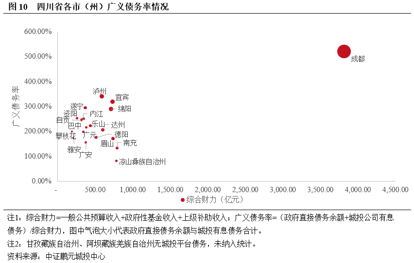 成都市廣義債務規模較大,廣義債務率遠超其余地區宜賓、瀘州、遂寧、綿陽處于第二梯隊。從廣義債務規模來看,成都市廣義債務規模近2萬億元,體量較大;其次為宜賓、綿陽和瀘州,廣義債務規模在2,000億元左右;眉山、達州、遂寧、南充和樂山在第三梯隊,廣義債務規模在1,000億元左右。從廣義債務率來看,成都市廣義債務率最高,達520%;宜賓、瀘州、遂寧、綿陽處于第二梯隊,廣義債務率在300%左右。