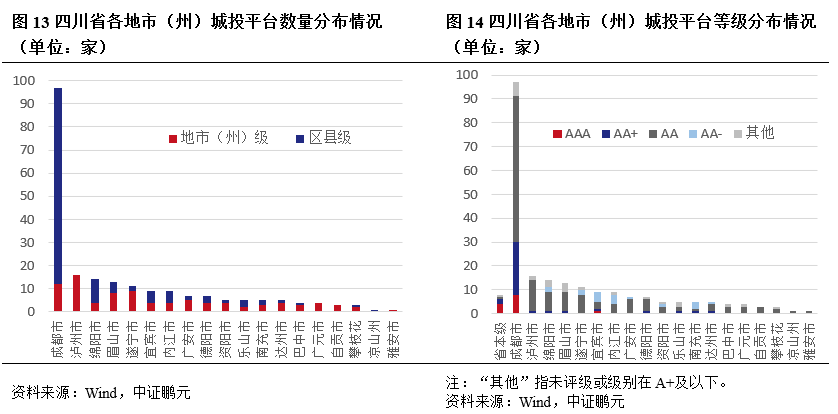 區域金融資源方面,對于國有大行、股份制銀行和異地城農商行在當地設有分行的城市,區域城投平臺獲取信貸和投債額度具有便利性。四川省金融資源主要集中在成都市,成都市擁有6家國有大行分行和全部12家股份制銀行,分行數量合計達32家;其余分行數量前三的城市為綿陽、瀘州和德陽,數量分別為17家、16家和15家,綿陽市的股份制銀行和異地城商行分行數量均居首位;攀枝花、遂寧、巴中等5個地級市的銀行分行數量不足10家。