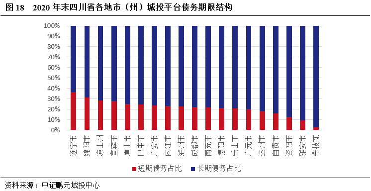 遂寧、綿陽城投短期債務占比較高,大部分地市(州)城投短期債務占比較為適中。債務期限結構方面,截至2020年末,遂寧和綿陽城投平臺的短期債務占比超過30%,短期償債壓力相對較大;大部分地市(州)城投平臺短期債務占比在20%-30%;有5個地市(州)城投平臺的短期債務低于20%,分別為達州、自貢、資陽、雅安和攀枝花,多為城投平臺數量和城投有息債務體量較小的地市(州)。