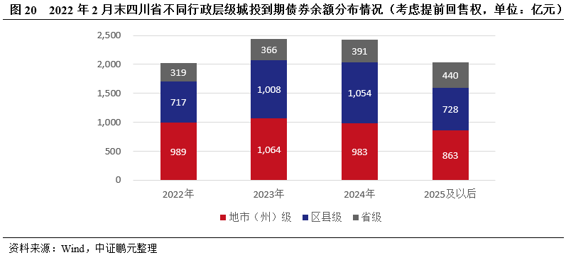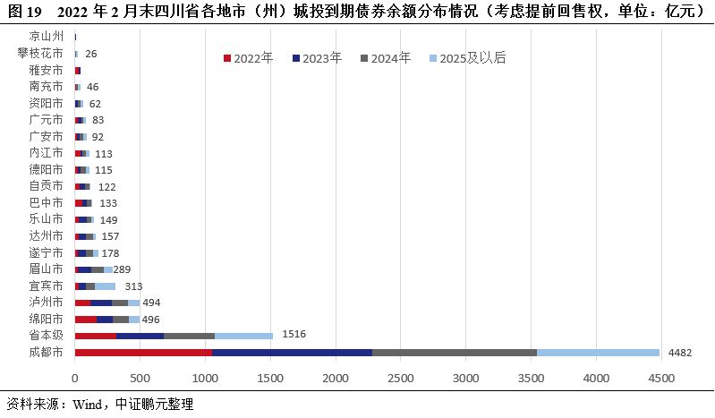 四川省城投債券到期分布總體較為均勻,綿陽和巴中城投的短期償債壓力較大。截至2022年2月末,四川省城投平臺存量債券余額合計8,922億元,到期時間分布較為均勻,2022-2024年分別到期2,025億元、2,438億元和2,428億元,分別占存量債券余額的22.7%、27.3%和27.2%。2022年到期的城投債主要集中在成都市、省級、綿陽和瀘州,分別到期1,053億元、319億元、170億元和119億元,巴中市到期城投債為56億元,其余地市(州)均在50億元以下;綿陽和巴中2022年城投債到期償付壓力較大,到期債券規模分別為其一般公共預算收入(以2021年數據測算)的1.07倍和1.10倍。從行政層級來看,2022年到期的地市(州)級、區縣級和省級城投債規模分別為989億元、717億元和319億元,地市(州)級城投債券到期分布較為均勻。