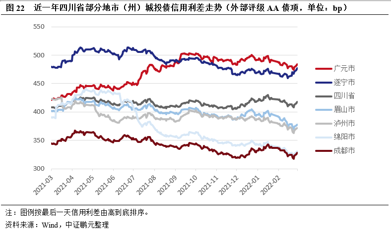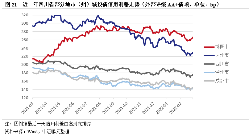 成都、瀘州信用利差整體表現較優,達州市高等級(AA+)城投債信用利差較高但近一年大幅收窄,綿陽市不同級別城投債信用利差走勢分化,其高等級(AA+)城投債市場認可度偏低。四川省城投債集中在成都市,其余地市州城投債券體量相對較小,本報告針對外部債項評級為AA+或AA的城投債分別選取對應級別下債券規模較大的地市(州)進行信用利差分析。整體來看,受資金面整體平穩、全面降準以及經濟恢復不均衡等因素影響,2021年全年城投債收益率以下行為主。分區域來看,四川省各地市(州)城投債信用利差分化較大,成都、瀘州經濟財政實力相對較強,信用利差低于全省平均利差;遂寧、廣元經濟財政基礎偏弱,信用利差明顯高于全省平均水平,且近一年來廣元市信用利差大幅走擴;眉山市經濟體量偏小,財政收入規模一般,但其為距離成都市最近的地級市,也是國家級天府新區、成都經濟區的重要組成部分,市場認可度尚可,近一年信用利差低于四川省平均水平;達州經濟體量靠前,財政自給能力較弱,AA+級城投債信用利差明顯高于全省平均,但近一年利差大幅收窄,統計樣本中達州市AA+級債券發行主體主要為達州市投資有限公司,2021年下半年發行短期債券規模較大,或較大程度壓降了區域利差水平;綿陽市短期債務償付壓力較大,不同級別的城投債信用利差走勢分化明顯,近一年高等級(AA+)債券信用利差逐漸走擴,且持續高于全省平均水平,而低等級(AA)債券信用利差逐漸收窄,從高于全省平均收窄至明顯低于全省平均,統計樣本中綿陽市高等級(AA+)債券發行主體主要為綿陽市投資控股(集團)有限公司,該公司債務負擔較重,或影響其市場認可度。