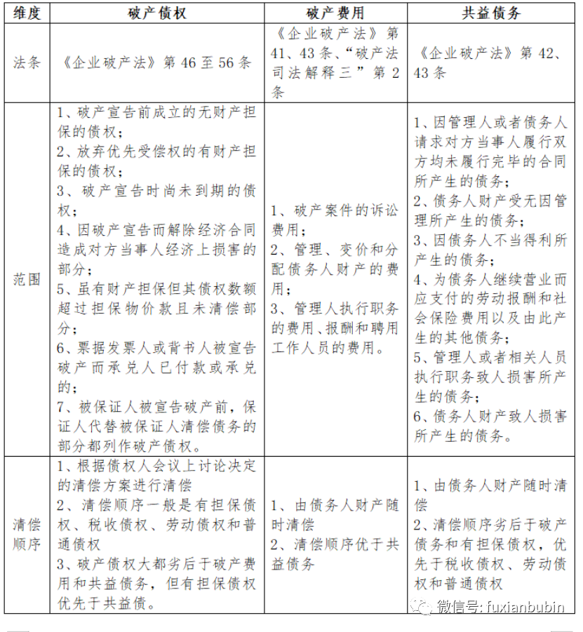 在我國《企業破產法》2006年修訂時,將共益債務與破產費用進行分離,考慮到二者均是為債權人的共同利益而負擔且均由債務人財產隨時清償,清償順序均優先于大部分破產債權。為更好的厘清共益債范圍,對破產費用、破產債權和共益債進行對比分析如下: