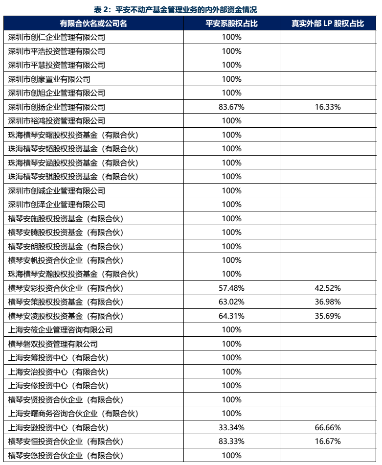 GP+LP模式的層層嵌套下,大多數(shù)LP為平安系公司或其關(guān)聯(lián)公司(包括深圳市陸虹投資管理有限公司)。在打造市場化資產(chǎn)管理公司的口號聲下,此舉形同粉絲打榜買熱搜。不過,由于LP資金多為自家人注資,從另一角度亦可視作杠桿度較低,風(fēng)險(xiǎn)較低。