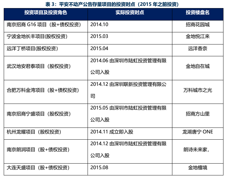 根據(jù)公司的20年中報(bào),多數(shù)股權(quán)投資項(xiàng)目始于15年投資,近一步追溯相關(guān)公開信息網(wǎng)站,則可以發(fā)現(xiàn)平安不動產(chǎn)許多存續(xù)項(xiàng)目其實(shí)已在14年入股,并于15年中更換投資主體。