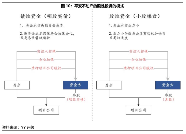 而導(dǎo)致項(xiàng)目周轉(zhuǎn)率低的主因,除了底層投資標(biāo)的和項(xiàng)目合作方不靠譜外,大概率是股性資金觸發(fā)了合作方人性的弱點(diǎn)“低資金壓力導(dǎo)致項(xiàng)目去化動機(jī)較小”。(若為股+債權(quán)模式,平安5.90%的利息成本對于地產(chǎn)開發(fā)商仍較低廉)