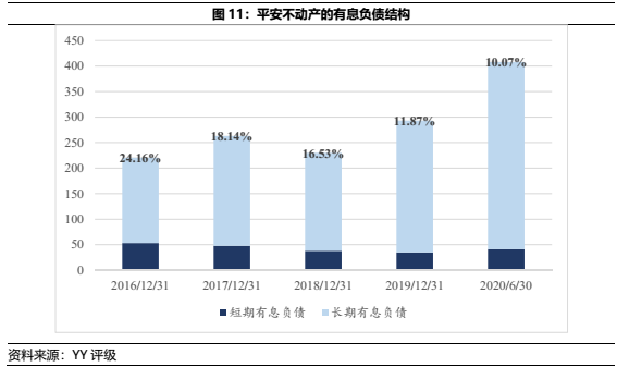 由于平安不動產(chǎn)的管理規(guī)模擴(kuò)增是基于平安集團(tuán)的LP資金(體現(xiàn)于長期股權(quán)投資方面的表外)注入,而表內(nèi)的結(jié)構(gòu)穩(wěn)定則是基于主動投資收益尚能覆蓋財(cái)務(wù)費(fèi)用,疊加被動收入和股東背景支持。因此圖11可見,隨著有息負(fù)債杠桿的增加,平安不動產(chǎn)仍能維持相當(dāng)?shù)捅壤亩唐谟邢鶆?wù)。