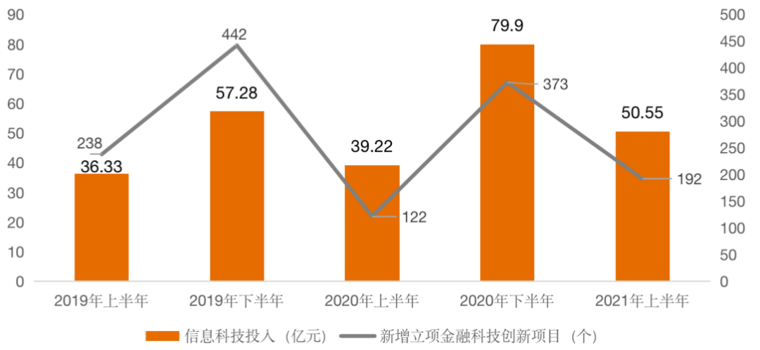 在金融科技領(lǐng)域取得顯著成就的同時,招行面臨著創(chuàng)新轉(zhuǎn)化能力下滑的問題。零壹智庫通過招行半年報與年報中披露的信息科技投入與金融科技創(chuàng)新項目累計立項,計算得出各期科技投入與新增立項數(shù)量。2021年上半年,在科技投入與上兩年同期相比有所增加的情況下,招行新增立項金融科技創(chuàng)新項目僅為192個,轉(zhuǎn)化效率有所下降。在加大科技投入的同時,提高創(chuàng)新轉(zhuǎn)化能力也是招行下半年應(yīng)發(fā)力的重點。