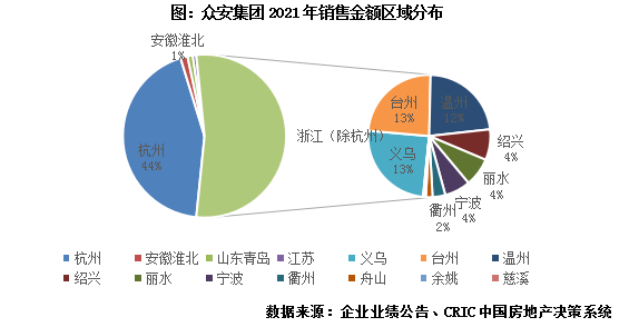【業(yè)績穩(wěn)健增長,銷售回款率突破100%】2021年眾安集團實現(xiàn)全口徑銷售額279.3億元,同比增長27.3%,銷售成績表現(xiàn)較為亮眼。其中97%左右的銷售額均來源于浙江省內(nèi),大本營杭州貢獻達44%。公司緊抓回款,全年共實現(xiàn)銷售回款292億元,回款率高達104.6%。未來,眾安仍將以保持穩(wěn)健經(jīng)營為首要目標,規(guī)劃2022年銷售金額目標300億元,2023年350億元,2024年400億元。2022年眾安整體可售貨值約635億元,僅需47.3%的去化率即可完成目標。