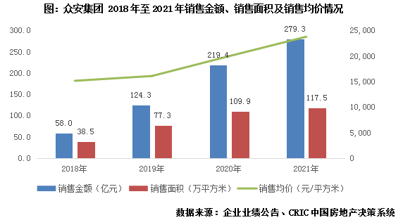全年實現(xiàn)銷售額272.3億元,銷售回款292億元。根據(jù)企業(yè)公告數(shù)據(jù),2021年眾安集團實現(xiàn)全口徑銷售額279.3億元,銷售面積117.5萬平方米,分別同比增長27.3%及6.9%。相較于百強房企-3%的負增長而言,企業(yè)的銷售成績表現(xiàn)較為亮眼。面對復(fù)雜多變的環(huán)境,公司緊抓回款,全年共實現(xiàn)銷售回款292億元,回款率高達104.6%,幫助企業(yè)維持現(xiàn)金流健康。