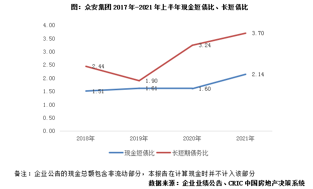 【三條紅線全部綠檔,明年將迎來償債高峰】截止至2021年底,眾安集團共持有現(xiàn)金177.5億元,現(xiàn)金短債比提升至2.14,長短債比為3.70。企業(yè)借款總額約為人民幣169.9億元,其中一年以內(nèi)債務(wù)占比21%,1-2年債務(wù)占比45%,明年將會迎來償債高峰。企業(yè)整體融資成本為6.20%,相較2020年底略有下降。凈負債率略有升高至77.5%,剔除預(yù)收賬款資產(chǎn)負債率同樣略有升高至66.9%,不過仍滿足三道紅線綠線要求。在業(yè)績會上,公司也發(fā)布了未來債務(wù)管控目標,保持資產(chǎn)負債率<65%,現(xiàn)金短債比>1.2以及凈負債率<40%。