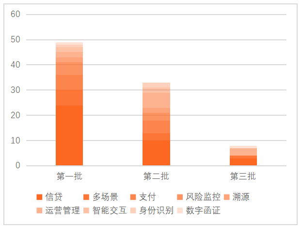 ①擴(kuò)寬試點(diǎn)深度:以北京為例,應(yīng)用規(guī)模由第一批的6個(gè)增加為第二批的11個(gè),由單一的銀行領(lǐng)域拓展到保險(xiǎn)領(lǐng)域,涉及的業(yè)務(wù)場(chǎng)景也更加廣泛。