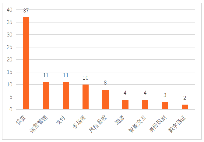截至2021年6月,三批金融科技創(chuàng)新監(jiān)管試點(diǎn)應(yīng)用主要針對(duì)的領(lǐng)域有信貸、運(yùn)營(yíng)管理、支付、多場(chǎng)景、風(fēng)險(xiǎn)監(jiān)控、溯源、智能交互、身份識(shí)別、數(shù)字函證等。其中,有37項(xiàng)試點(diǎn)主要針對(duì)信貸領(lǐng)域,占41%。信貸、運(yùn)營(yíng)管理、支付、多場(chǎng)景四大領(lǐng)域的試點(diǎn)共有69個(gè),占77%,可見(jiàn)試點(diǎn)應(yīng)用針對(duì)領(lǐng)域的集中度較高,需求主要集中在信貸、運(yùn)營(yíng)管理、支付、多場(chǎng)景四大領(lǐng)域。