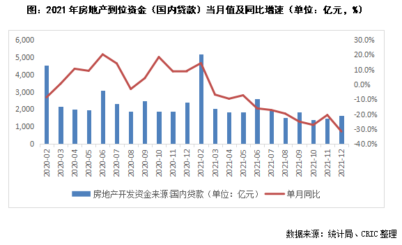 2021年房地產開發資金來源(國內貸款)達23296億元,同比降幅較11月末的10.8%進一步擴到12.7%,企業融資端仍難言回暖。