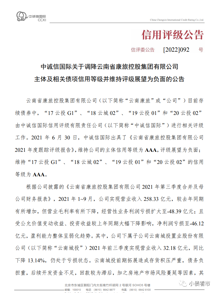 此前,2021年12月聯合資信也將云南康旅評級展望由“穩定”調整為“負面”,其信用資質已持續惡化。