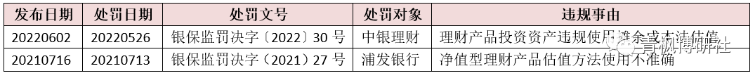 從罰單上看,監(jiān)管部門也開(kāi)始更關(guān)注理財(cái)產(chǎn)品估值。2021年7月與2022年5月,銀保監(jiān)會(huì)分別對(duì)浦發(fā)銀行與中銀理財(cái)開(kāi)出罰單,理由分別為“凈值型理財(cái)產(chǎn)品估值方法使用不準(zhǔn)確”和“理財(cái)產(chǎn)品投資資產(chǎn)違規(guī)使用攤余成本法估值”。