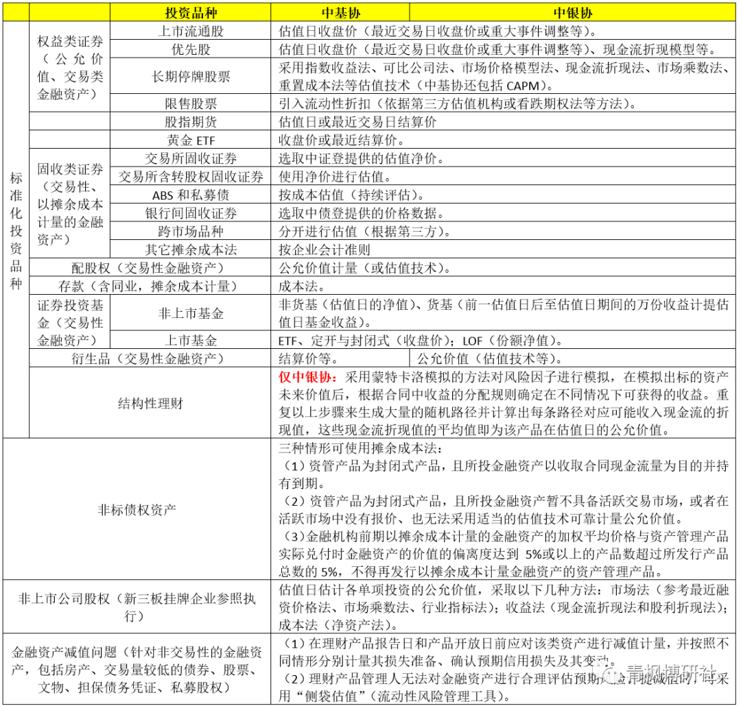 (四)中基協(xié)與中銀協(xié)關(guān)于資管投資品種估值標(biāo)準(zhǔn)的對(duì)比