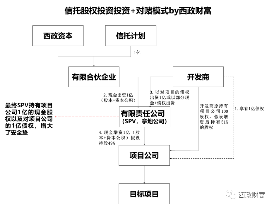 1. 信托計劃投資有限合伙LP份額(即1億)對有限責任公司SPV進行增資,部分進入實收資本,大部分進入資本公積。開發商則以對項目公司的債權(或債權+部分現金)對SPV進行出資。