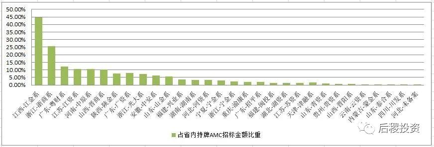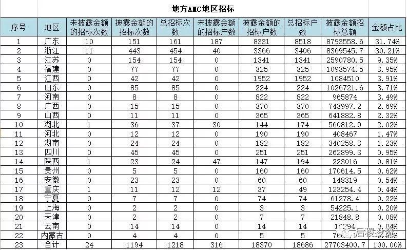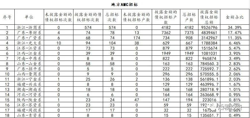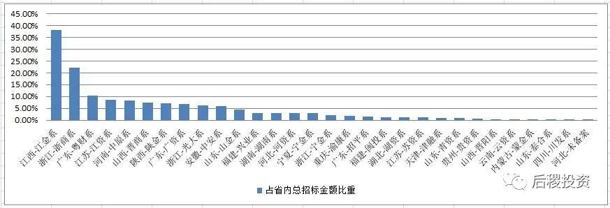 在省內(nèi)招標總比重方面和在包括四大在內(nèi)的省內(nèi)持牌AMC招標中,地方AMC中份額前五的是江西的江金系、浙江的浙商系、廣東的粵財系、江蘇的江資系和河南的中原系,其中江西系占到了省內(nèi)持牌AMC的45%左右,而浙商系也占到了25%左右。