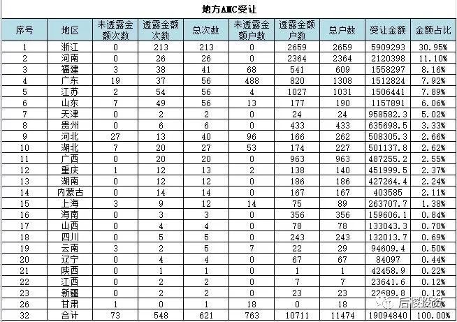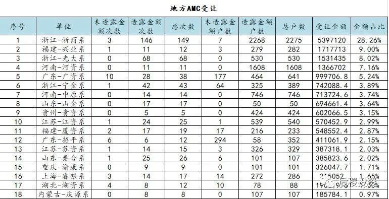 當(dāng)年全國地方AMC受讓621次10711戶,披露的總金額為1909.48億元。從受讓總次數(shù)上看,浙江的地方AMC表現(xiàn)得最為活躍。而從受讓總金額上看,浙商系遠遠超出其他地方AMC,而除浙江外,福建、河南和廣東的地方AMC的受讓規(guī)模相對較高。