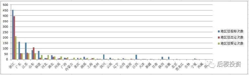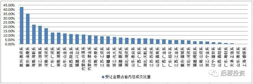 受讓金額占比超過5%的熱點地區(qū)是浙江、河南、福建、江蘇、廣東和山東,其中河南以及后面的天津排名靠前的原因,與出讓一樣。
