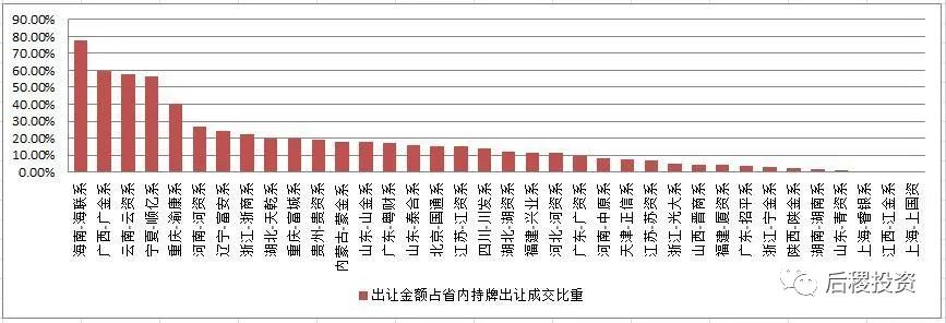 省內(nèi)出讓比重直接反映了該AMC在當(dāng)?shù)氐膫鶛?quán)出讓市場占有率。從總成交比重上看,廣金系、海聯(lián)系、河資系、浙商系、渝康系、天乾系、粵財系、山金系、江資系、蒙金系、河資系均超過了5%,最高的廣金系達到了16%以上。而在省內(nèi)持牌AMC出讓比重里,海聯(lián)系、廣金系和云資系均超過了50%,渝康系也達到了40%,河資系、富安系和浙商系也超過了20%。
