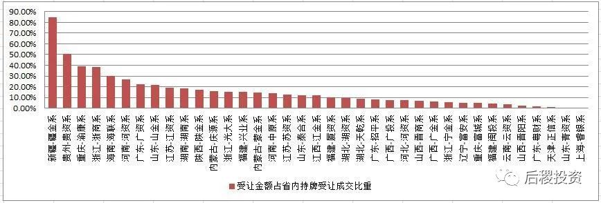 省內(nèi)受讓比重直接反映了該AMC在當(dāng)?shù)氐膫鶛?quán)受讓市場占有率。從數(shù)據(jù)結(jié)果上看,順億系、貴資系和渝康系均占到了當(dāng)?shù)厥茏屖袌龅?0%以上,而海聯(lián)系、浙商系、河資系也占到了接近20%。而在包括四大全國AMC的持牌AMC受讓中,順億的比重為100%,即唯一參與者,而疆金系、貴資系、渝康系均超過了40%,浙商系、海聯(lián)系、河資系、廣資系和山金系也都占20%以上。