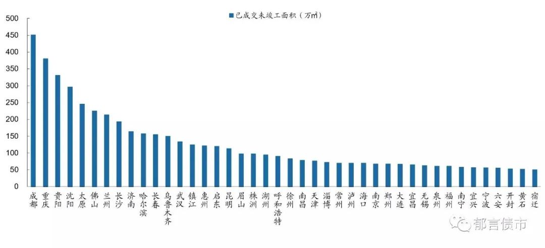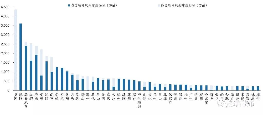 在售項目與待售項目合計達到1000萬方的城市包括:黃岡、德陽、烏魯木齊、成都、濟南、重慶、沈陽、南寧、南通、啟東、貴陽、太原等13個。