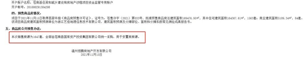 11月15日,蒼南翡翠華庭1647套房源全部由蒼南縣國有資產投資集團有限公司統一采購,用做安置房房源。