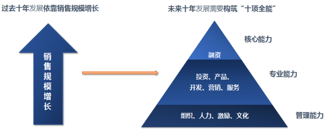 第二,企業經營戰略、經營理念、經營模式隨行業發展而轉變是績效管理調整的直接原因。房地產行業新的時代背景下,房企也從過去銷售“一枝獨秀”逐漸過渡到需要構建“十項全能”的能力。