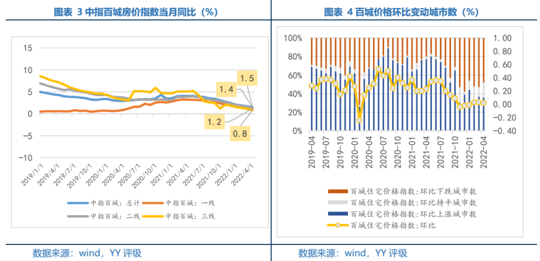 價(jià)格方面百城價(jià)格同比和環(huán)比均回落,其中一、三線同比下降幅度較3月更大。一線城市需求主因疫情限制,而弱三線普遍仍是“以價(jià)換量”思路,但結(jié)合銷售規(guī)模來(lái)看,此效果已大打折扣。環(huán)比上漲城市減少1個(gè),新增6個(gè)持平,更多地城市房?jī)r(jià)維持低迷常態(tài),三線城市價(jià)格反彈的趨勢(shì)目前來(lái)看并不成立。