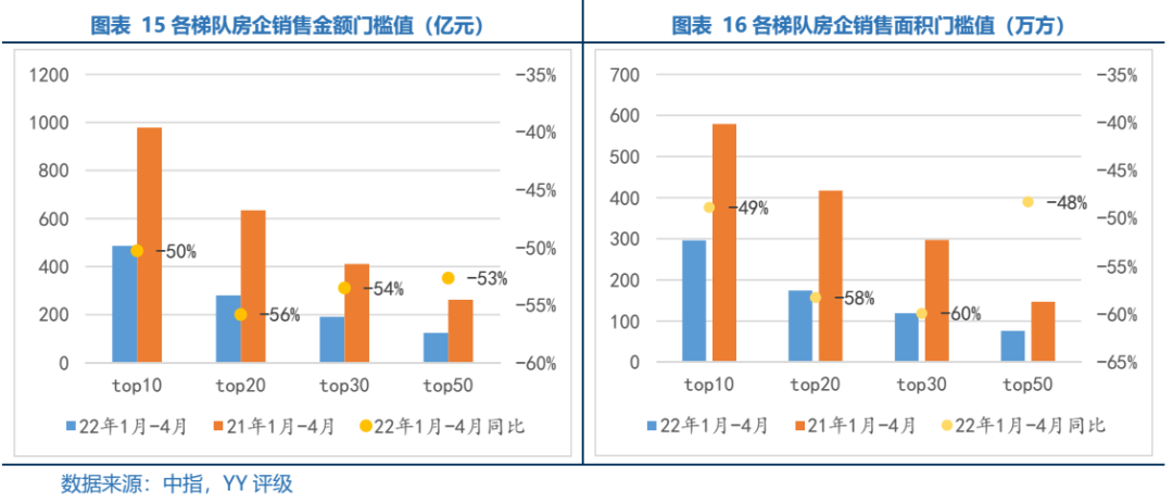 銷售門檻值方面,2022年1-4月全國(guó)TOP10-50房企銷售金額同比下滑50%至53%不等,中間檔房企銷售門檻下滑更為嚴(yán)峻。